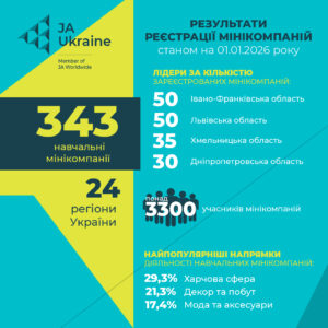 Junior Achievement Ukraine повідомляє про значне розширення участі у всеукраїнській освітній програмі з підприємництва «Компанія». Станом на 1 січня 2026 року вже зареєстровано 343 навчальні мінікомпанії, у яких беруть участь 3337 здобувачів освіти з різних регіонів України.